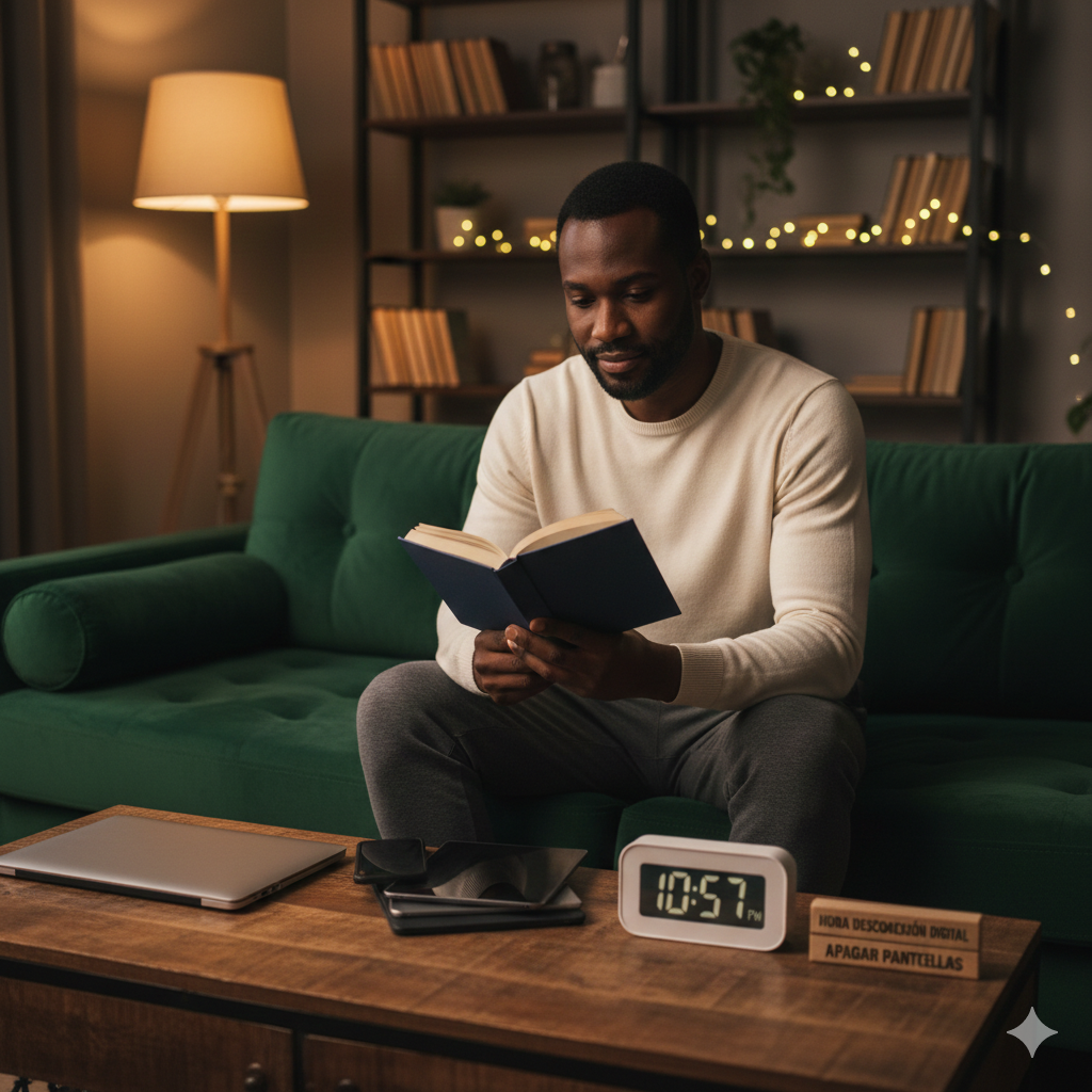 La luz azul del teléfono y el scroll infinito son asesinos de la productividad y del sueño. Necesitas una hora sagrada antes de dormir: la Hora de Desconexión Digital. Apaga todas las pantallas (celular, tablet, computadora) al menos 60 minutos antes de que tu cabeza toque la almohada.