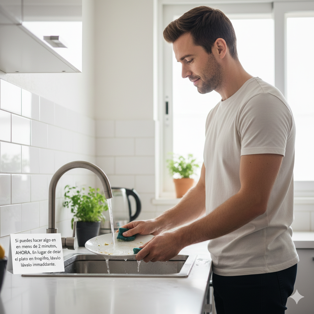 La regla de oro es simple: Si puedes hacer algo en menos de 2 minutos, hazlo AHORA. En lugar de dejar el plato en el fregadero, lávalo inmediatamente. En lugar de posponer el correo, respóndelo. Al aplicar esta regla, liberas capacidad mental y ganas pequeñas victorias que suman un gran impulso de productividad y orden.
