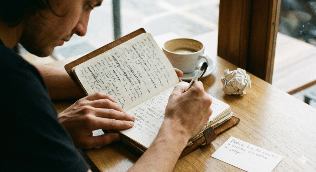 Dedica 5 a 10 minutos a escribir sin editar ni juzgar. Esto reduce la ansiedad porque transformas el caos mental en algo concreto en papel. Al final del día, te permite “cerrar” el día y no llevarte los problemas a la cama. Al inicio, te ayuda a identificar las 3 tareas más importantes. Es terapia barata y ultra efectiva.