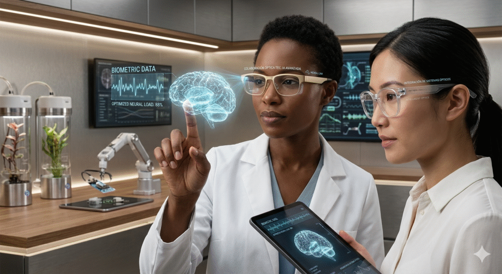 La conectividad ha evolucionado del “internet de las cosas” hacia el “internet de los cuerpos”. Un ejemplo claro es la colaboración entre gigantes tecnológicos y firmas de óptica para crear gafas de realidad aumentada que integran Inteligencia Artificial.