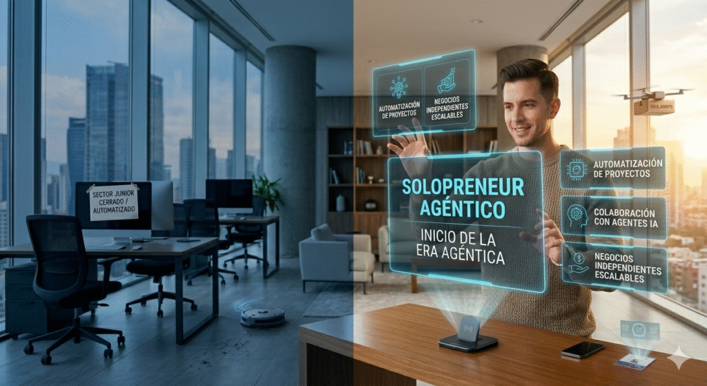 Si estás empezando tu carrera, las noticias son crudas: los puestos junior de oficina han muerto. Pero no es el fin del mundo, es el inicio de la era del Solopreneur Agéntico. Hoy, un solo hombre con un buen set de agentes puede facturar lo mismo que una agencia de 10 personas. La IA diseña, la IA programa, la IA hace el marketing y la IA lleva la contabilidad.
